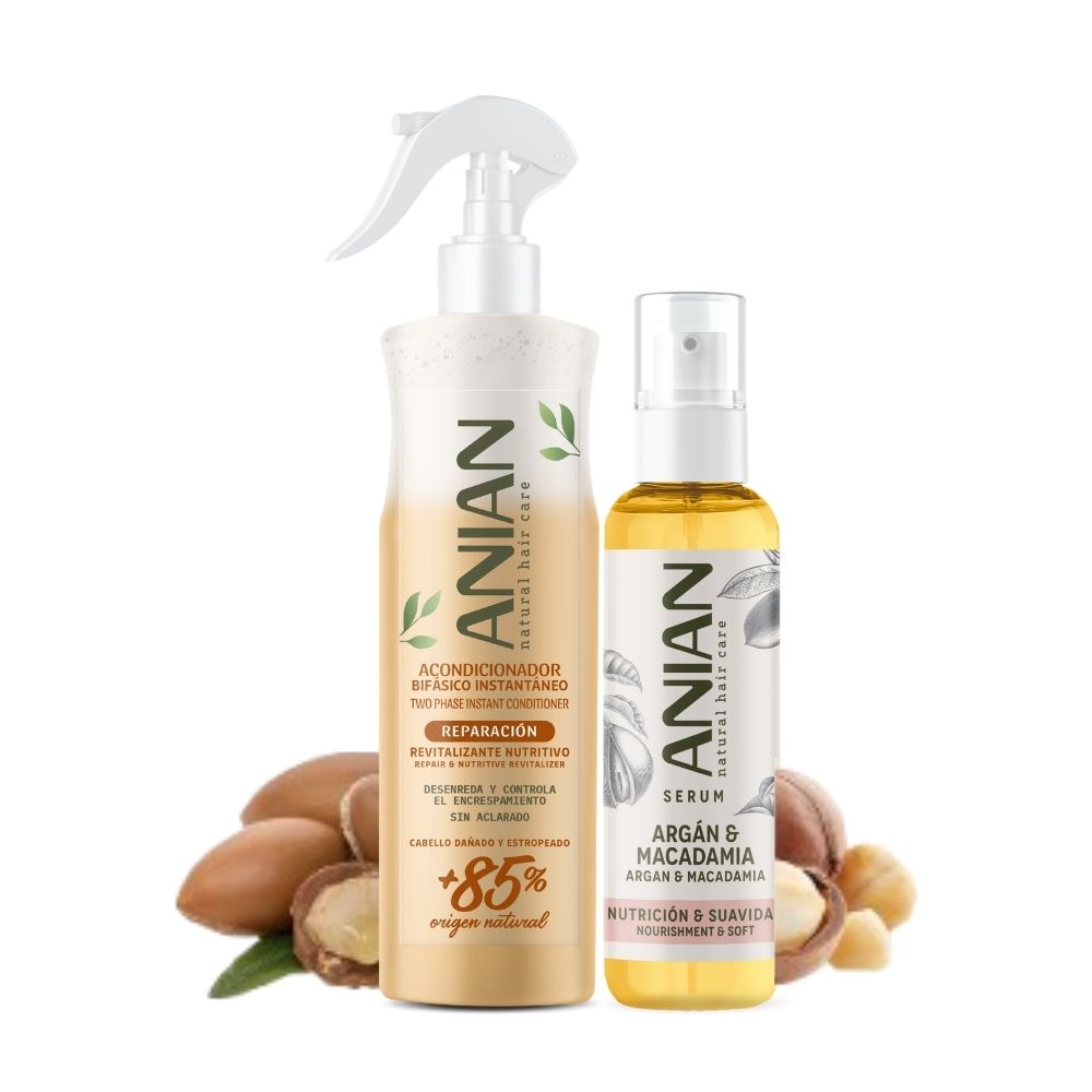 Recupera el brillo y la vitalidad de tu cabello con este tratamiento completo. El acondicionador bifásico sin enjuague hidrata, protege y desenreda al instante, mientras que el sérum nutritivo con argán y macadamia repara en profundidad, sella puntas abiertas y elimina el frizz. Ideal para cabellos secos, maltratados o apagados.